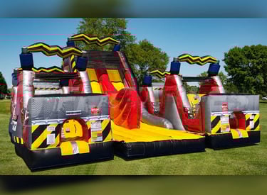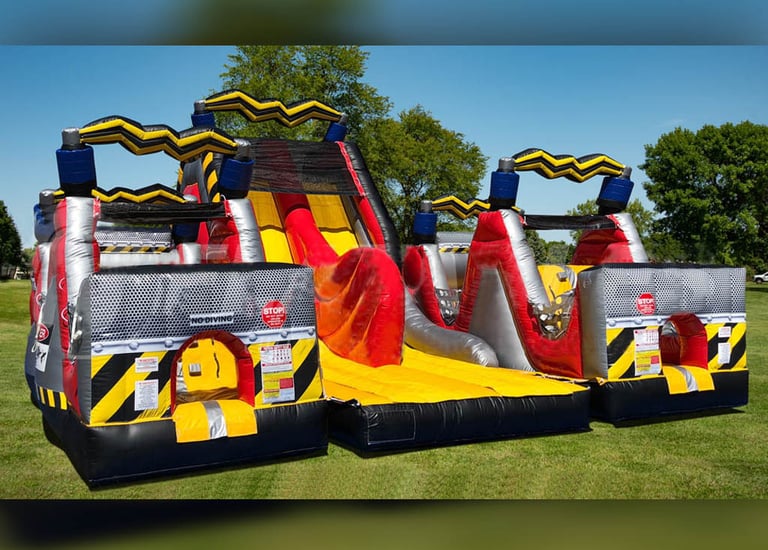 The High Voltage Chaos Obstacle Course Get ready for an absolute jolt of adrenaline! As the largest obstacle course in our fleet, the brand-new High Voltage Chaos is a massive, dual-lane powerhouse designed for high-capacity fun. Featuring a towering 18ft slide and customizable attachments, this Made-in-the-USA attraction boasts an ultra-shine finish that pops at any event. Whether you’re racing a friend or tackling the hurdles, this vivid, high-strength course is guaranteed to be the "electrifying" centerpiece of your midway. Don’t get shocked—book the Chaos today!
